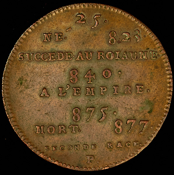 Легенда аверса "CHARLES II ROY DE FRANCE". Легенда реверса "25 - NÉ 823 - SUCCEDE AU ROIAUME 840 - A L’EMPIRE 875 - MORT 877 - SECONDE RACE P."