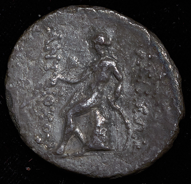 На реверсе изображен Аполлон Дельфийский, сидящй на омфале влево, в правой руке держащий стрелу, в левой - лук. Легенда "BAΣIΛEΩΣ ANTIOΧOΥ".
