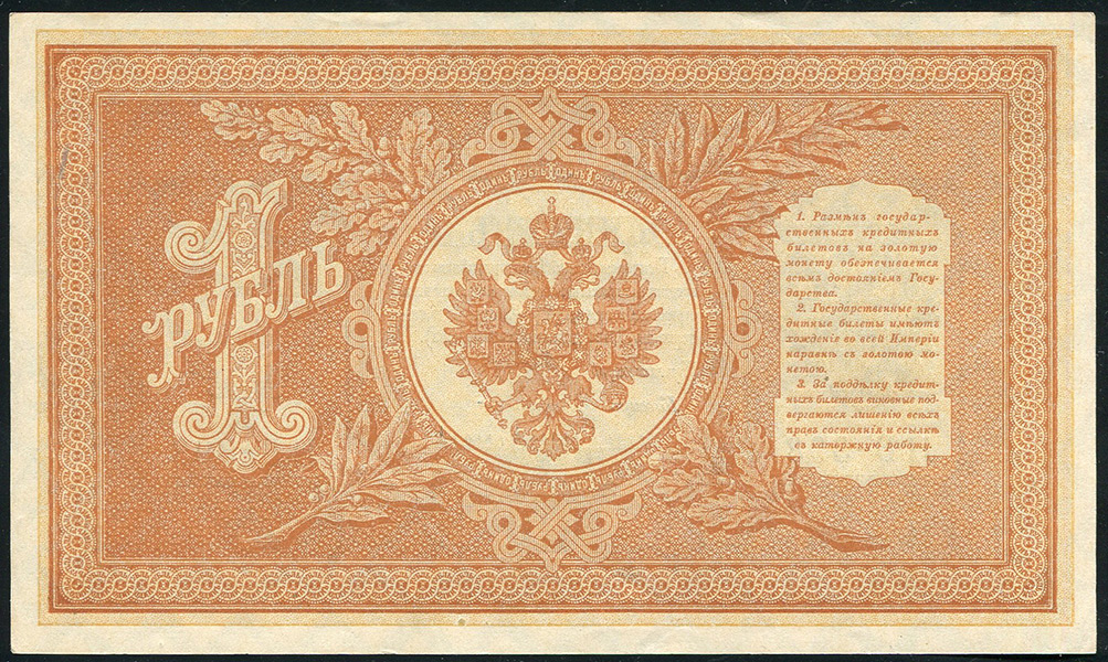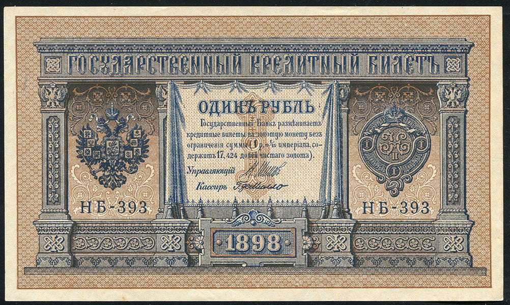 Государственный кредитный билет 1 рубль образца 1898 года, модификация 1915 года (с упрощенной нумерацией), НБ-393. Управляющий Шипов, кассир Г де Милло. Выпуск советского правительства.