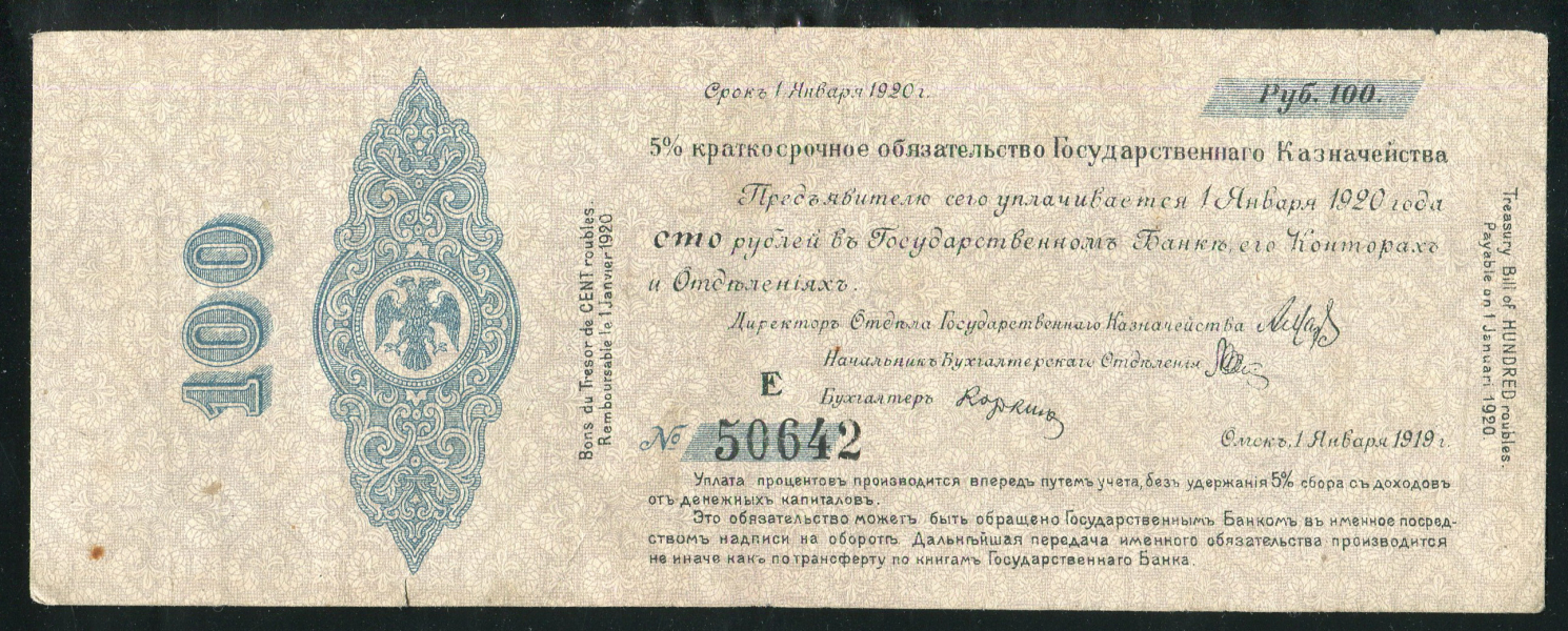 5% краткосрочное обязательство Государственного Казначейства 100 рублей образца 1919 г., Е №50642. Омск, 1 января 1919 г. Группа X-I. Вариант написания месяця с буквой i в конце: "Januari".