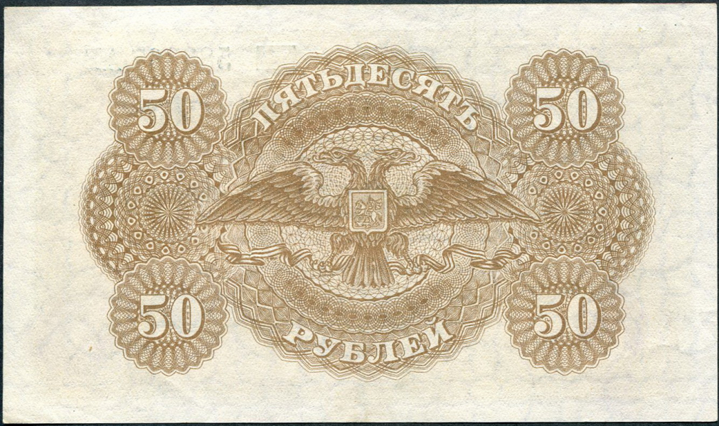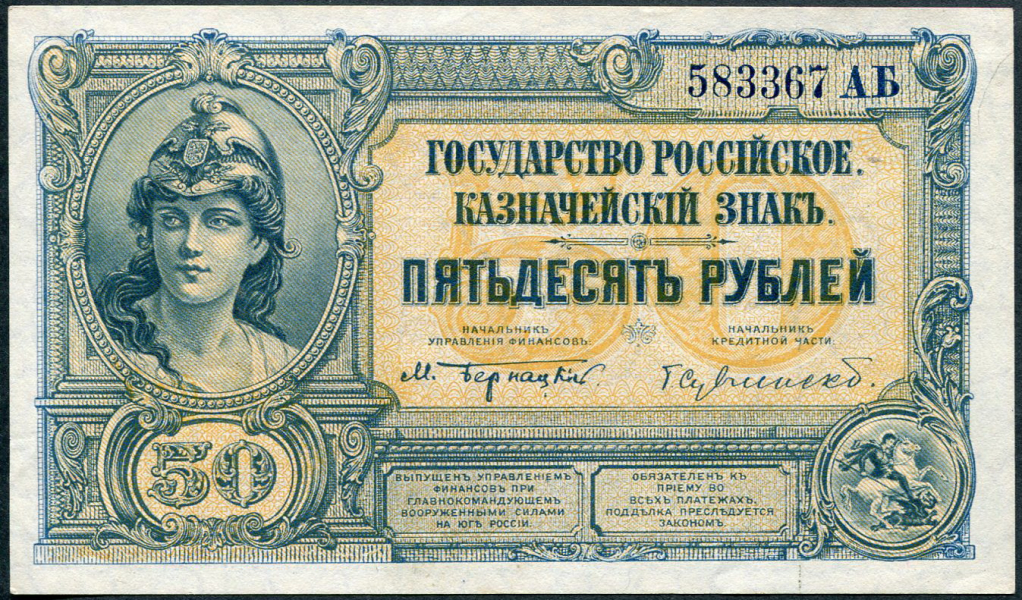 Государство Российское. Управление финансов при главнокомандующем Вооруженными силами на Юге России. Казначейский знак 50 рублей образца 1919 года, 583367 АБ. Типография "Waterlow & Sons".