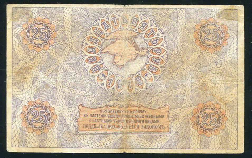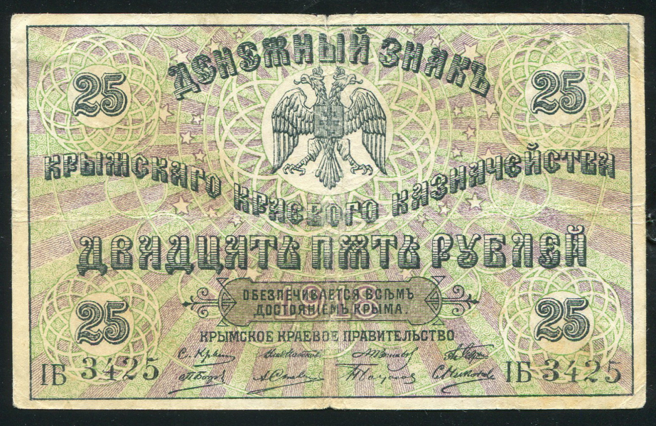 Денежный знак Крымского краевого казначейства 25 рублей 1818 года, IБ 3425. Выпуск белогвардейского правительства.