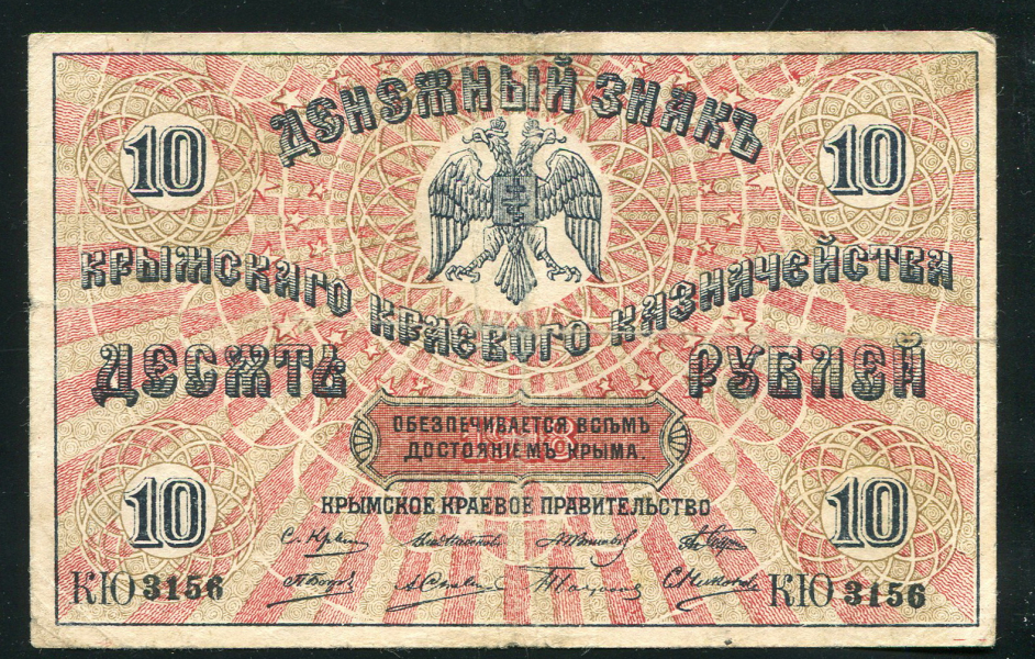 Денежный знак Крымского краевого казначейства 10 рублей 1818 года, КЮ 3156. Выпуск белогвардейского правительства.