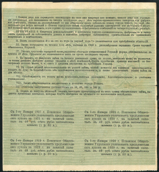 С 1 января 1919 г. Псковское Общественное Управление уплачивает по предъявлении сего купона за 1919 г. на занятый капитал в 40 рублей один рубль шестьдесят копеек (1 рубль 60 копеек).
