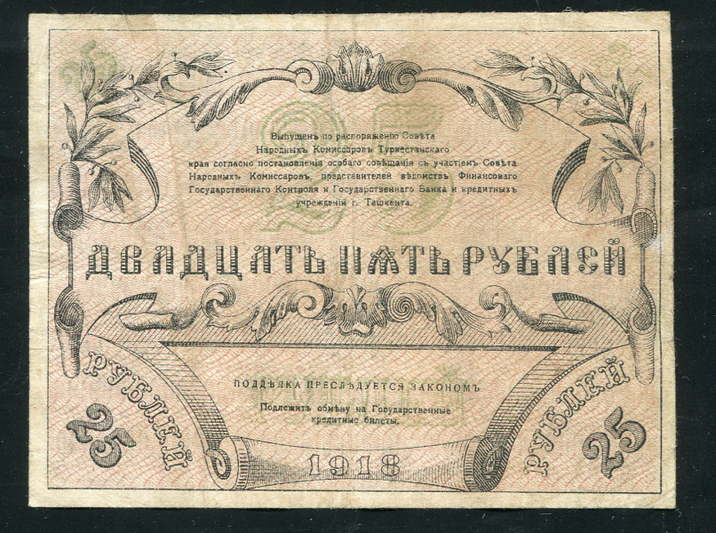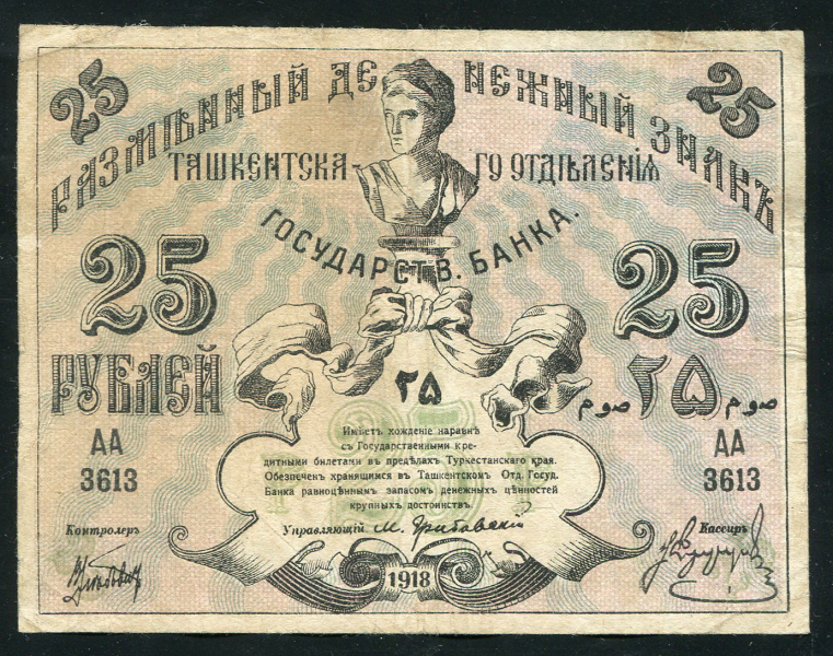 Разменный денежный знак Ташкентского Отделения Государственного банка 25 рублей 1918 г., АА 3613. Кассир Фирфаров.