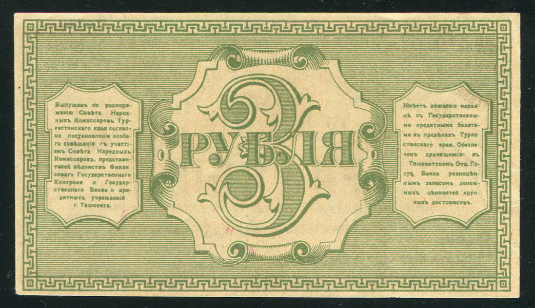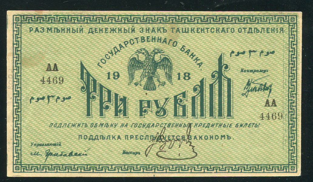Разменный денежный знак Ташкентского Отделения Государственного банка 3 рубля 1918 г., АА 4469. Кассир Фирфаров.