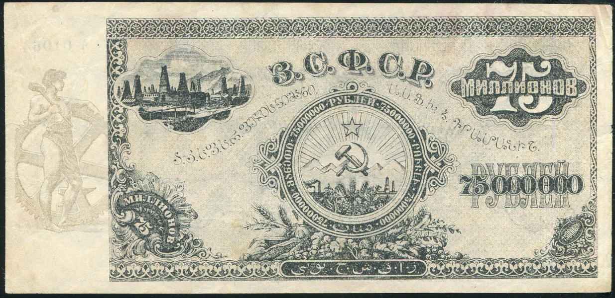 Денежный знак Закавказской Социалистической Федеративной Советской Республики 75000000 рублей 1924 года, А 01064. С в/з.