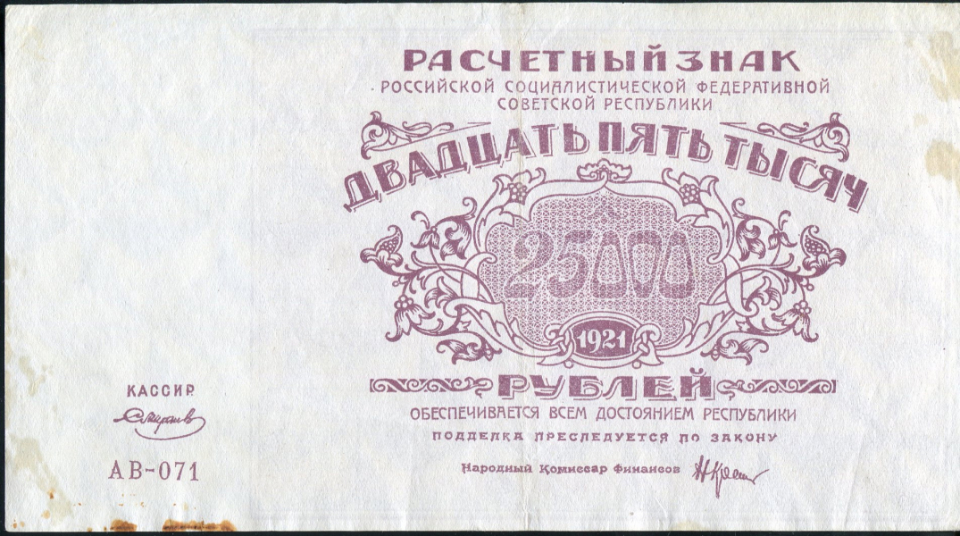 Pick #115а. Расчетный знак РСФСР 25000 рублей образца 1921, АВ-071. Кассир Смирнов. В/з Большие теневые звезды. Ростовская фабрика Гознака.