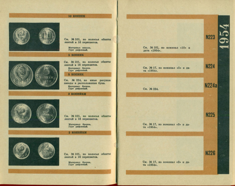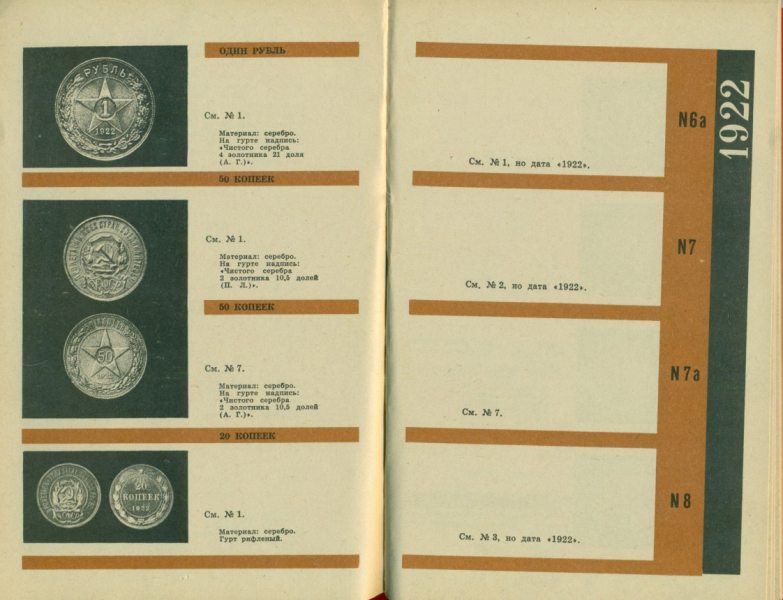 Альбом-каталог составленный по нумизматических коллекциям государственного исторического музея и Государственного Эрмитажа. Основные этапы развития советского монетного чекана. Научный редактор В.Л. Янин. Систематическое описание монет СССР с 1921 по 1967 гг. Описаны 303 монеты с учетом их разновидностей. Один из первых иллюстрированных каталогов по монетам СССР регулярного чекана.