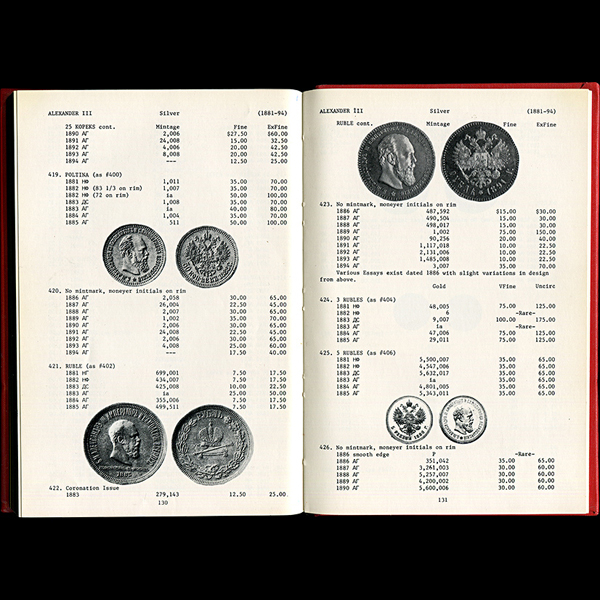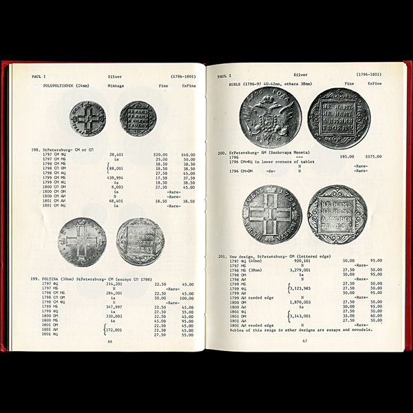 Первое издание легендарного "Путеводителя по русским монетам", долгие годы являвшийся основным доступным за рубежом справочником и каталогом-ценником по русским монетам. Важным являлось и то, что в каталоге приведено большое, по тем временам, количество фотографий в качестве иллюстраций.