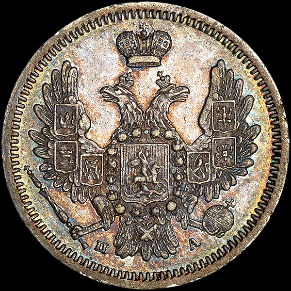 Отличный коллекционный экземпляр. Штемпельный блеск. Легкая матовость рельефа. По краю монеты - насыщенная радужная патина длительного коллекционного хранения. Очень редка.