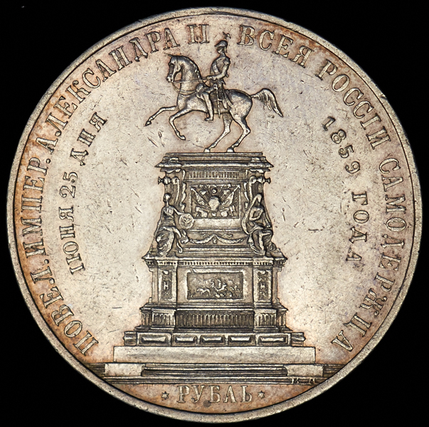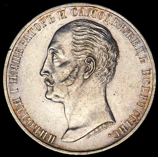 Чеканен по случаю открытия памятника императору Николаю I в Санкт-Петербурге. В обрезе шеи "А.Лялин". Плоский чекан.