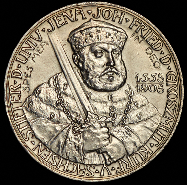 Легенда аверса "1558 / 1908 / IN DEO / JOH FRIED D GROSZMUT KURF V SACHSEN STIFTER D UNIV JENA / SPES MEA".