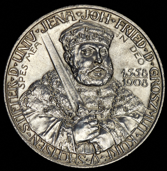 Легенда аверса "1558 / 1908 / IN DEO / JOH FRIED D GROSZMUT KURF V SACHSEN STIFTER D UNIV JENA / SPES MEA".
