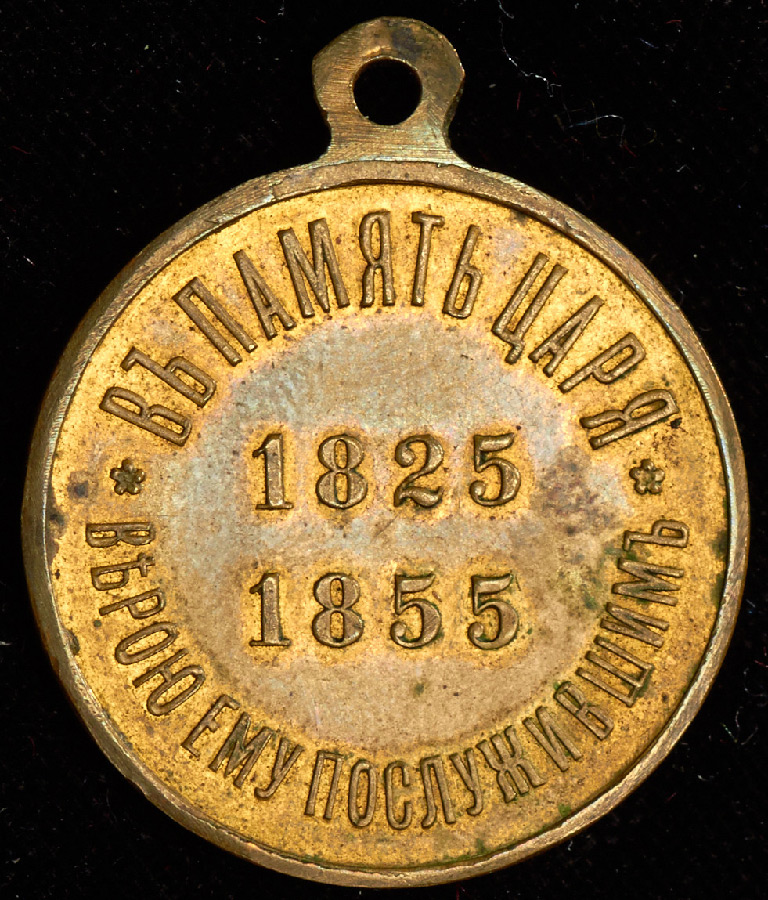 Учреждена в 1896 г. в память 100-летия со днярожденияимператора Николая I. С легендой "ВЪ ПАМЯТЬ ЦАРЯ / ВЪЕРОЮ ЕМУ ПОСЛУЖИВШИМЪ". Серебряной медалью награждали всех офицеров и классных чинов, состоявших в годы правления Николая I, на действительной службе, бронзовой - нижних чинов. Медаль носили на соединенной Александровско-Владимирской ленте.
