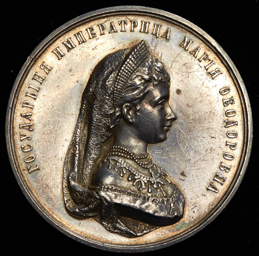 На аверсе медали портрет Марии Федоровны вправо в русской одежде, вокруг надпись "Государыня императрица Мария Федоровна".