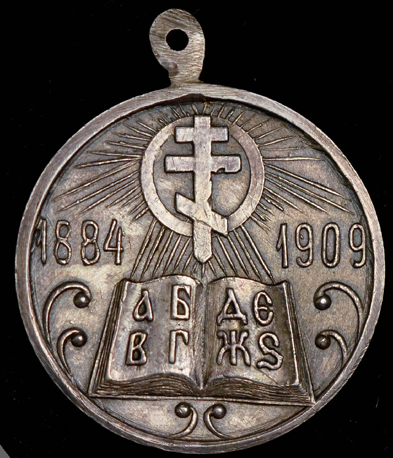 Учреждена 29 мая 1909 г. «в память исполнившегося 13 июня 1909 г. двадцатипятилетия со времени восстановления … Императором Александром III церковной школы». Медалью награждали всех состоявших на действительной службе к 13 июня 1909 г.: членов Синода и присутствовавших в нем архипастырей, обер-прокурора Синода и его товарища; председателя училищного совета, издательской при нем комиссии и его помощника; штатных чинов канцелярии училищного совета и состоявших при нем учреждений; председателей и членов епархиальных училищных советов и уездных отделений, наблюдателя церковных школ и его помощников, епархиальных окружных и уездных наблюдателей; ректоров духовных семинарий и начальных женских епархиальных и духовного ведомства училищ, при которых имелись церковные школы; попечителей и попечительниц церковных школ, врача, архитектора училищного совета при Синоде, врачей церковно-учительских школ, заведующих, законоучителей и учителей в церковных школах. Высочайшим повелением от 19 февраля 1910 г. право на награждение медалью получили лица, не состоявшие к 13 июня 1909 г. на церковно-школьной службе, но в свое время пробывшие на ней не менее 10 лет. Этим же повелением медалью стали награждать ряд других штатных чинов центральных учреждений духовного ведомства. Награжденные приобретали медали за свой счет. Было выдано не менее 100000 свидетельств о награждении этой медалью.
