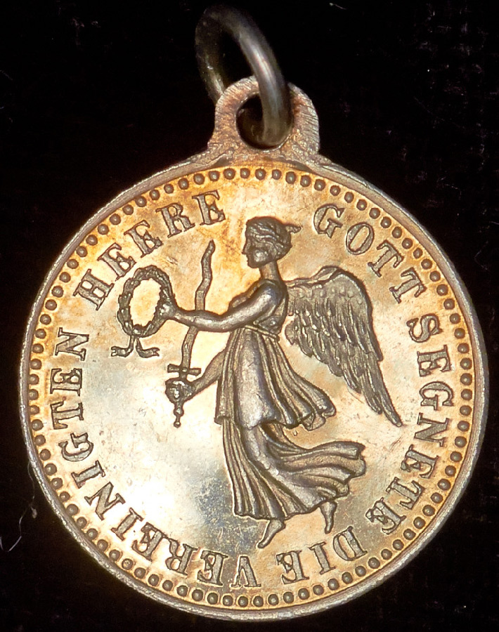На аверсе изображен стандартный для серии дизайн: крылатая фигура Победы с пылающим мечом и лавровым венком победителя, с надписью "GOTT SEGNETE UNSERE TAPFEREN HEERE" (Бог благословил наши доблестные армии).