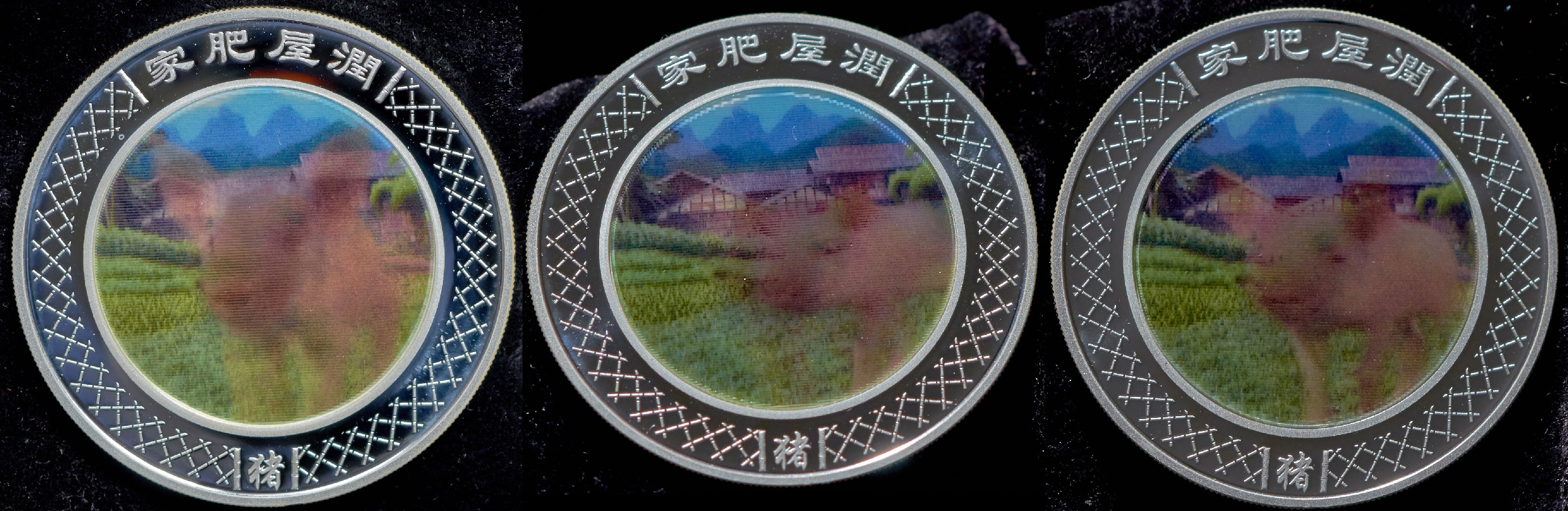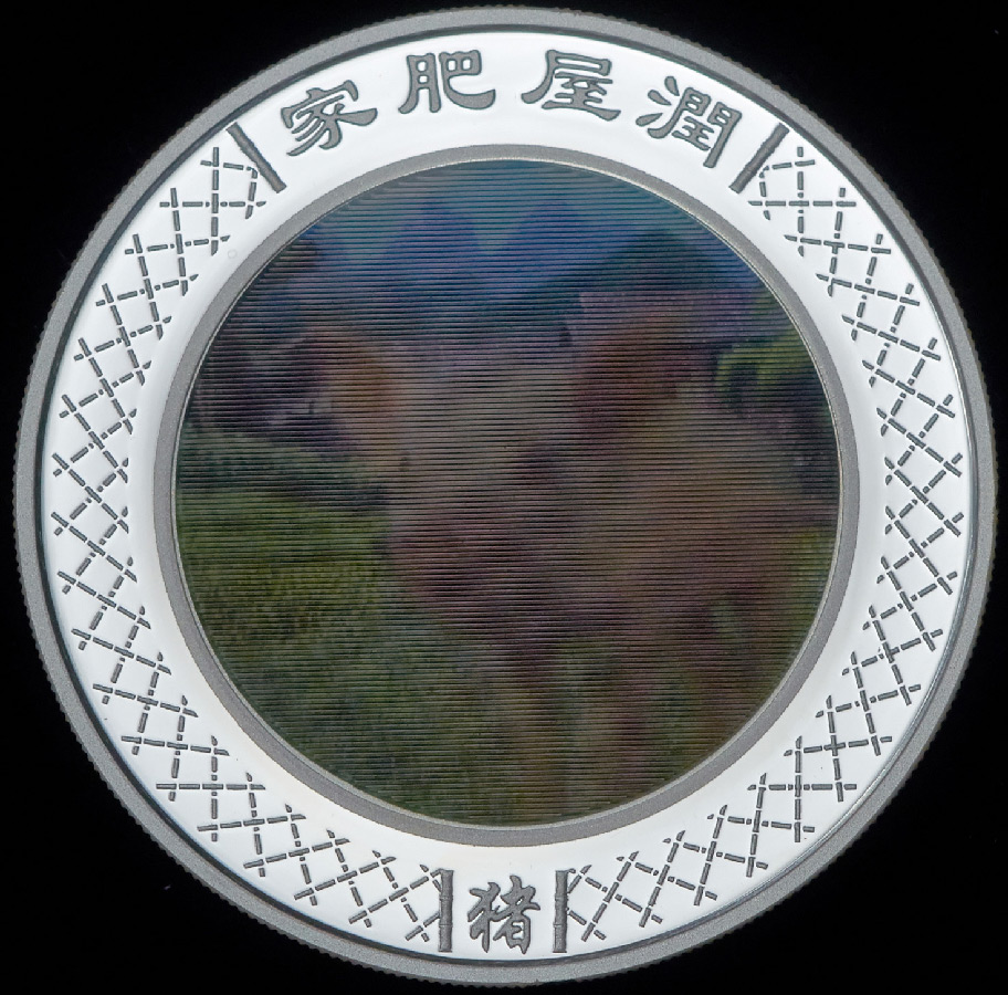 В центральной части реверса размещена круглая несъемная вставка, выполненная по специальной технологии, обеспечивающей эффект меняющегося цветного изображения. Если смотреть на реверс монеты, изменяя угол зрения, можно увидеть 24 последовательных кадра бегущего по полю поросенка. Центральное изображение дополняет узор в виде стилизованной бамбуковой изгороди, размещенный по кругу вдоль канта. Узор прерывается надписями на китайском языке (иероглифами): вверху – надписью со смысловым значением пожелания достатка и изобилия, внизу – обозначающей название изображенного животного («свинья»).