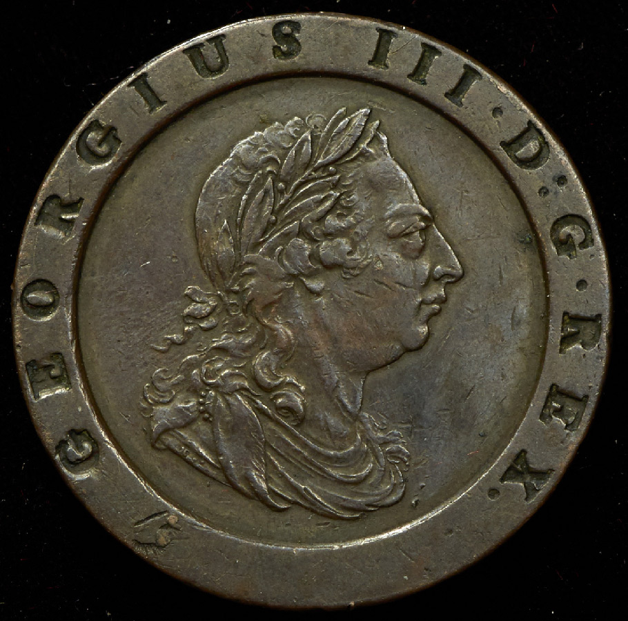 Самая крупная за всю историю Британии медная монета. В свое время она получила прозвище "колёсо телеги" - cartwheels. Это название было получено из-за больших веса и диаметра - ведь содержание меди в точности соответствовало номиналу: цена 2-х унций (56,7 грамма - вес монеты в 2 пенса) меди в 1797-м году равнялась 2 пенсам серебра. Диаметр монеты 41 мм., толщина 5 мм.