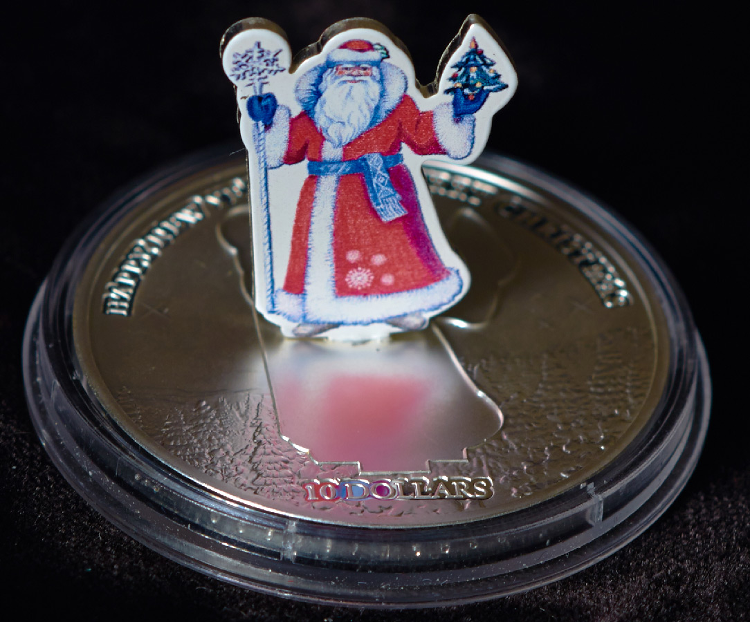 Монета имеет отделяему часть в виде Деда Мороза, которую можно установить в специальный паз на монете.