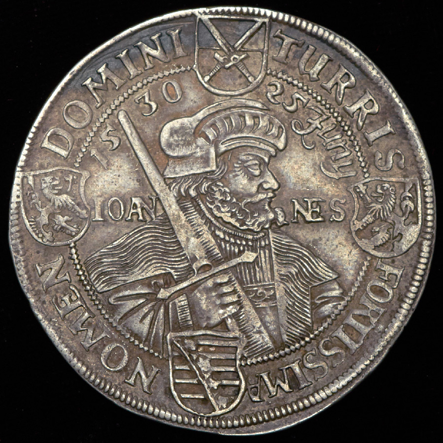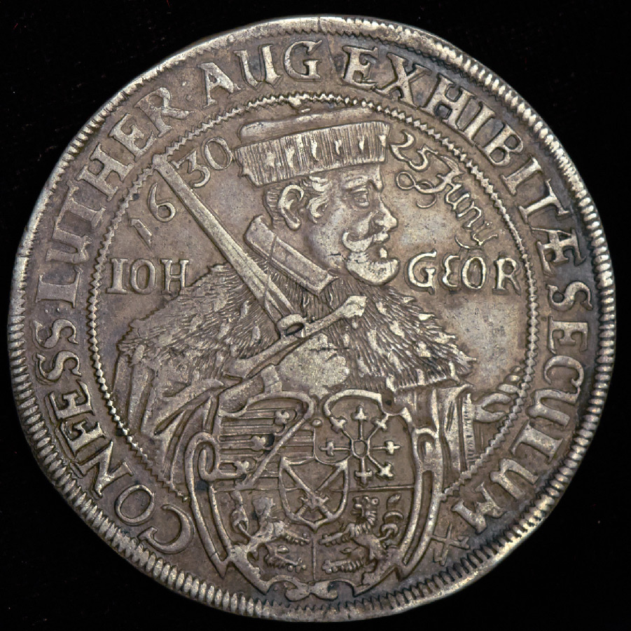 Данный талер посвящен 100-летию составления документа Аугсбургского вероисповедания, важного для всех лютеран. Был представлен на всеобщем собрании, вошедшим в историю как Аугсбургский рейхстаг. На аверсе Иоганн Твердый, с которого и началось лютеранство. Реверс – Иоганн Георг, время правления которого выпало на период 30-летней войны, в которой он, кстати, проявил себя не с лучшей стороны.