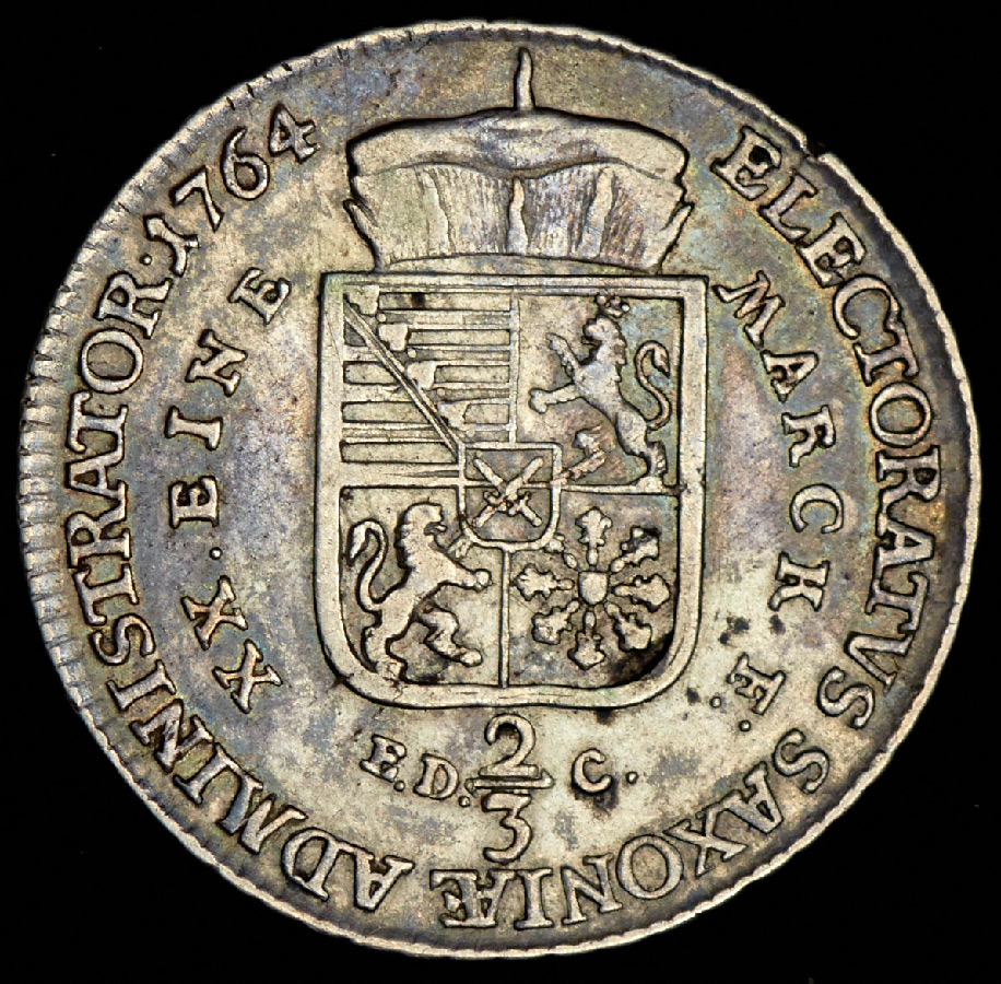 Реверс - герб Саксонии, "2/3" и "ED-C" под ним ("XX EINE MARCK F", "ELECTORATVS SAXONIAE ADMINISTRATOR 1764").