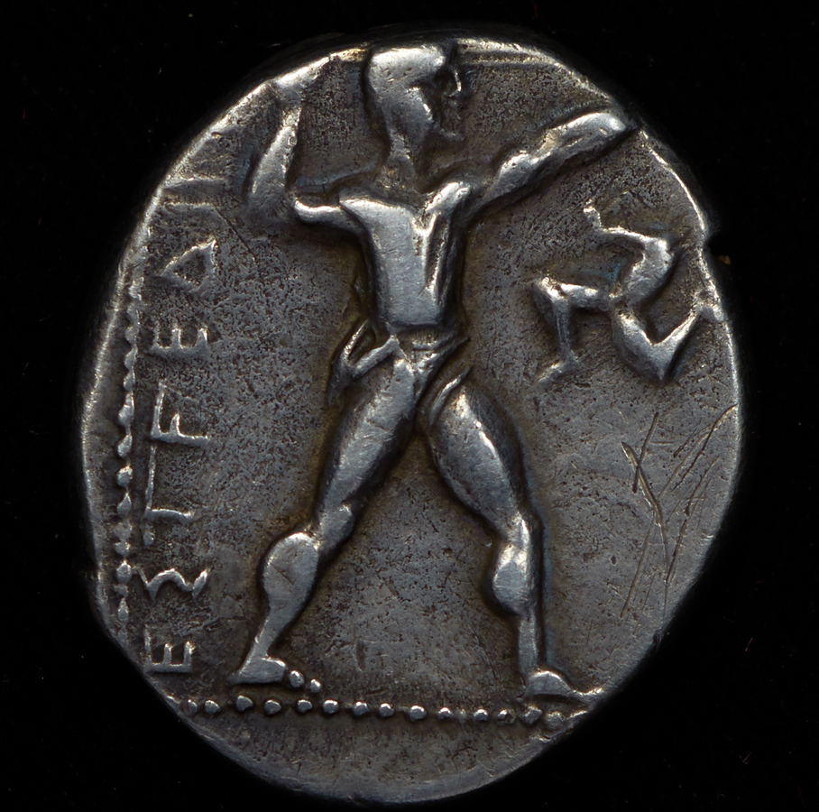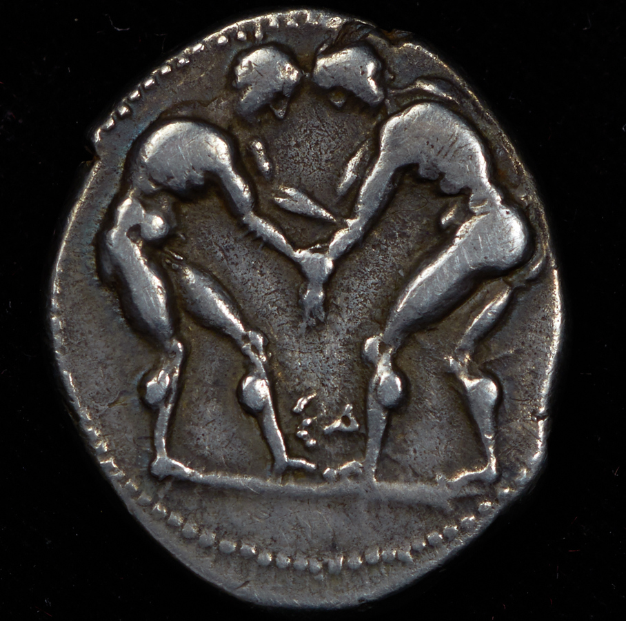Изображение двух борцов. На другой стороне Пращник и трискелион.