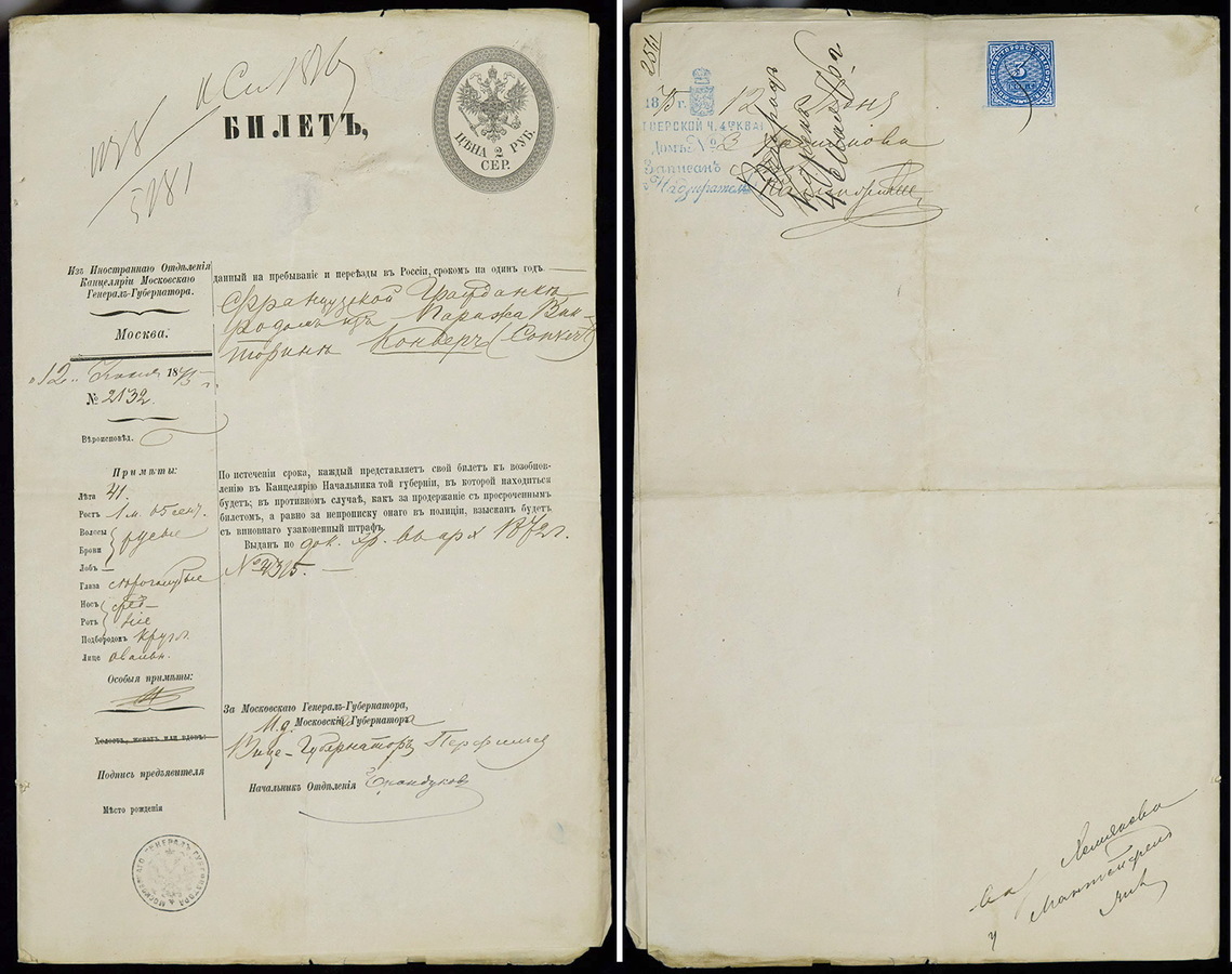 Билет на право пребывания и переезды в России. Выдан 12 июня 1975 года французской гражданке Викторине Конкер.