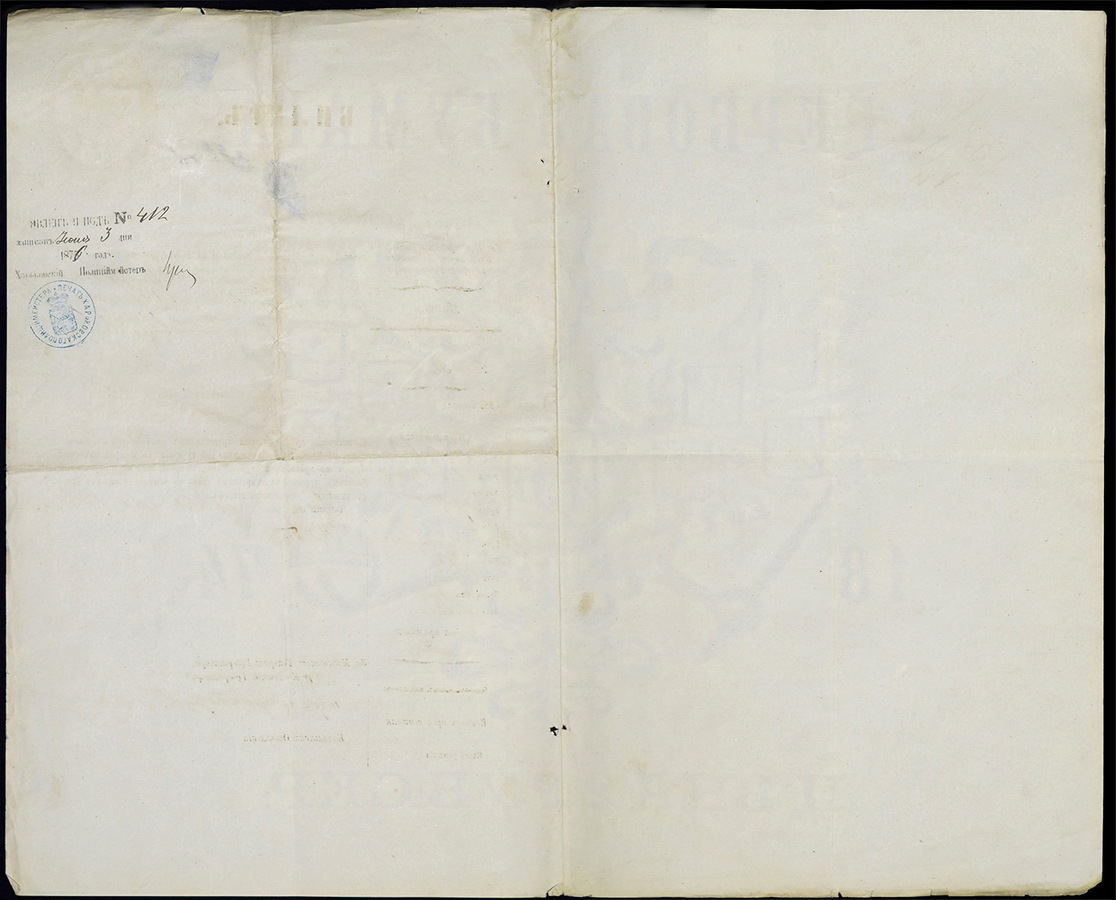 На сложенном вдвое листе гербовой бумаги 1874 года с водяными знаками.