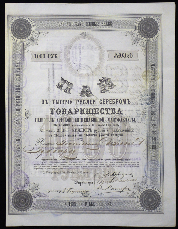 Пай 1000 рублей 1895 "Товарищества Шлиссельбургской ситценабивной мануфактуры"