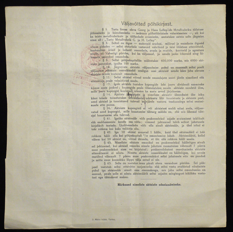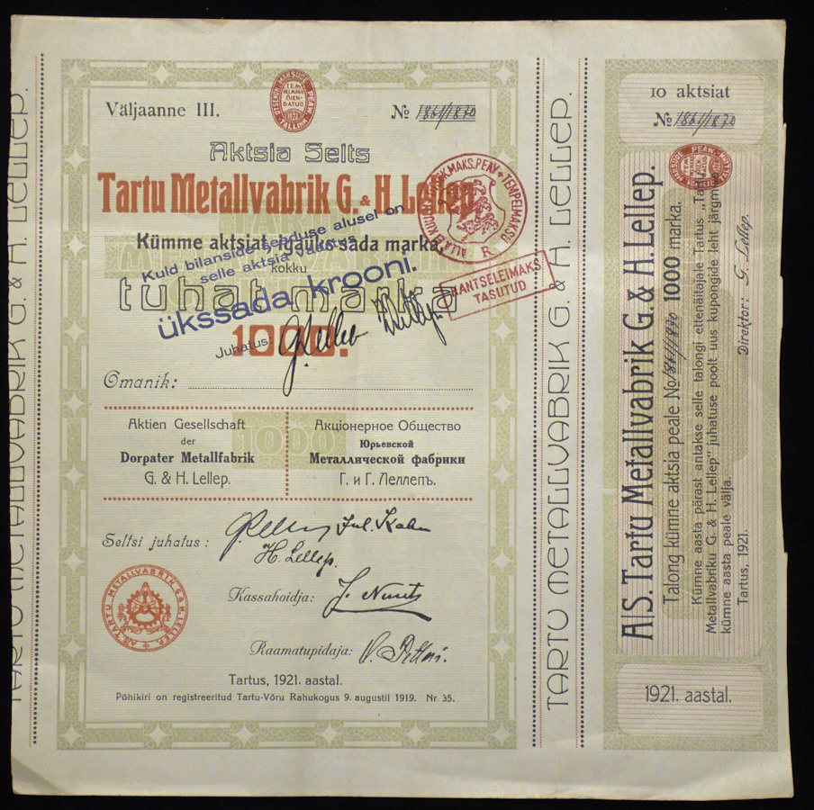 Акция 1000 марок 1921 "Тартуский металлургический завод"