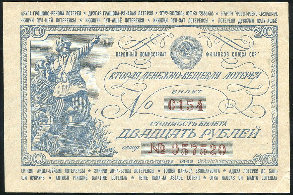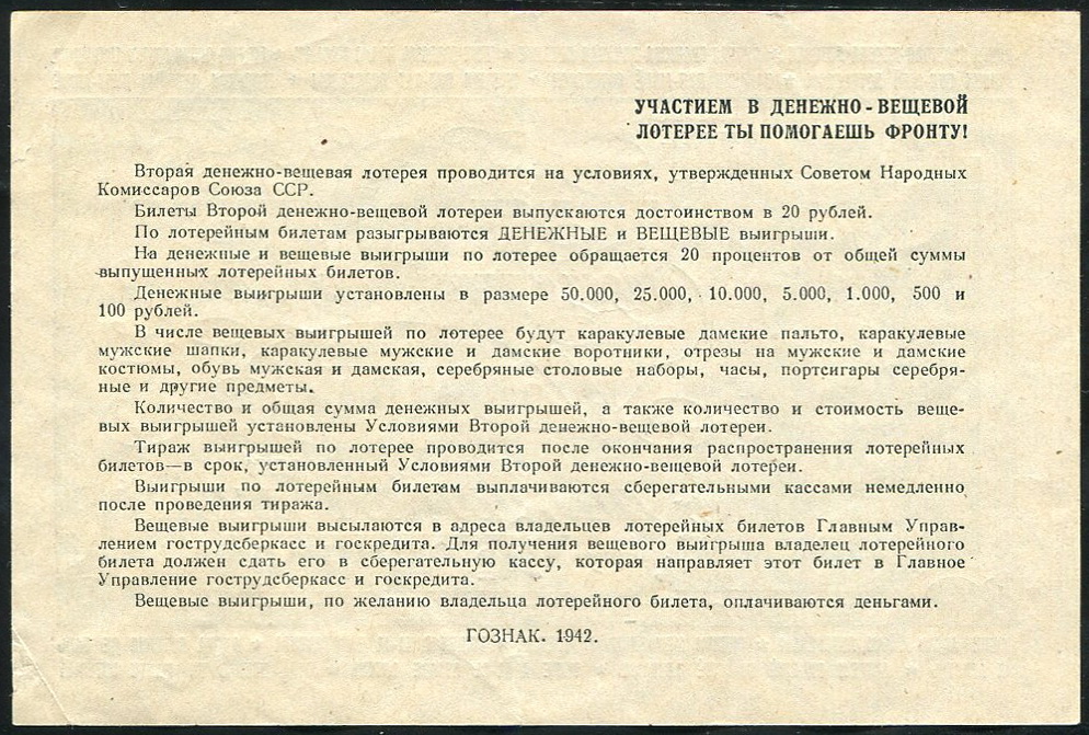 Билет "Вторая денежно-вещевая лотерея" 20 рублей 1942