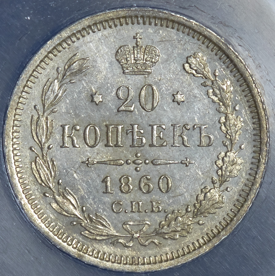 20 копеек 1860 (в слабе) СПБ-ФБ