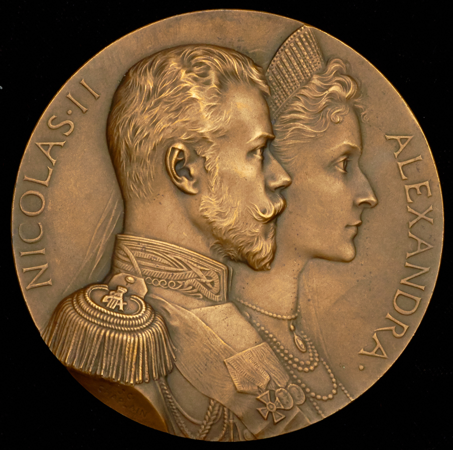 На аверсе совмещенные бюсты Николая II и Александры Федоровны вправо, на обрезе плеча подпись "J. C. CHAPLAIN."