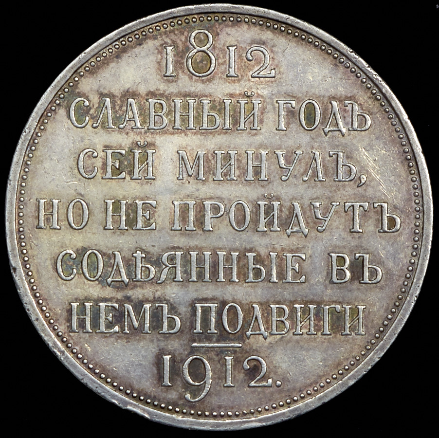 Чеканена в честь 100-летия победы в Отечественной войне 1812 года.