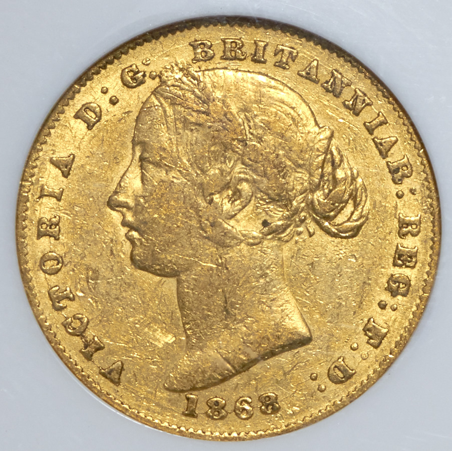 Легенда аверса "VICTORIA D: G: BRITANNIAR: REG: F: D:".