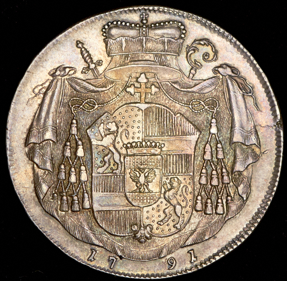 Легенда аверса "HIERONYMVS D.G. A. & P. S. A. S. L. N. G. PRIM." (Иероним, Божиею милостью, архиепископ и принц Зальцбурга.)