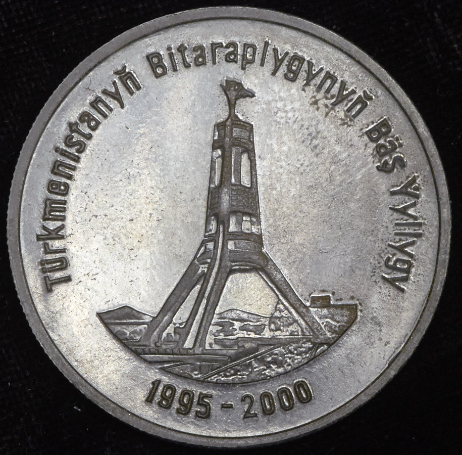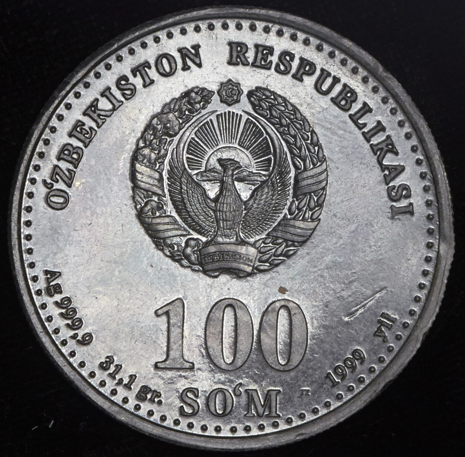 Пробный оттиск в свинце неутвержденного варианта оформления монеты 100 сумов 1999 года.