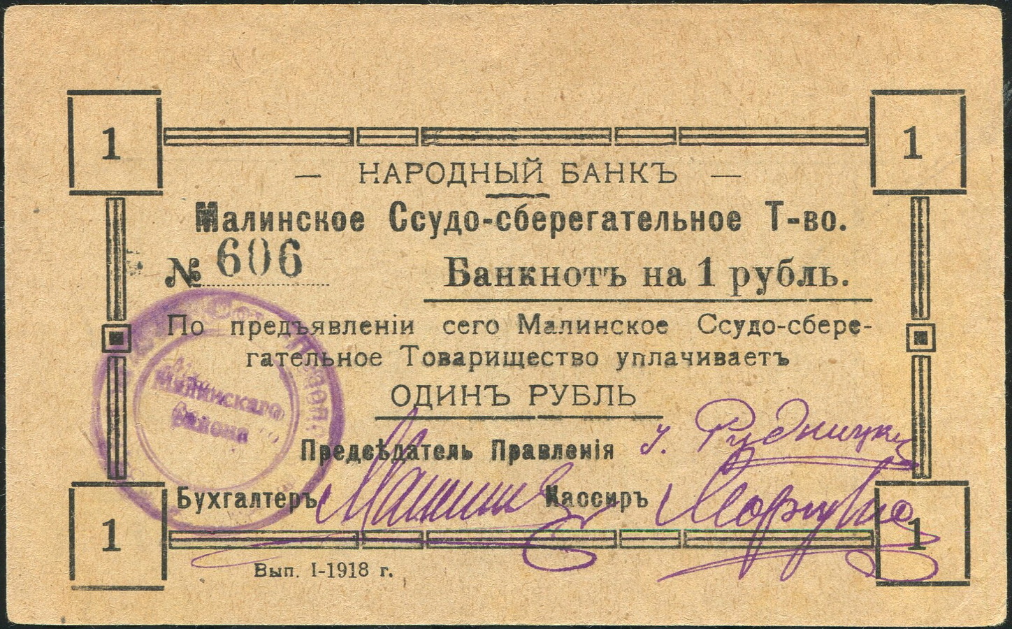 Народный Банк, Малинское Ссудо-сберегательное Товарищество, Киевская губерния, банкнот на 1 рубль 1918 года, №606.