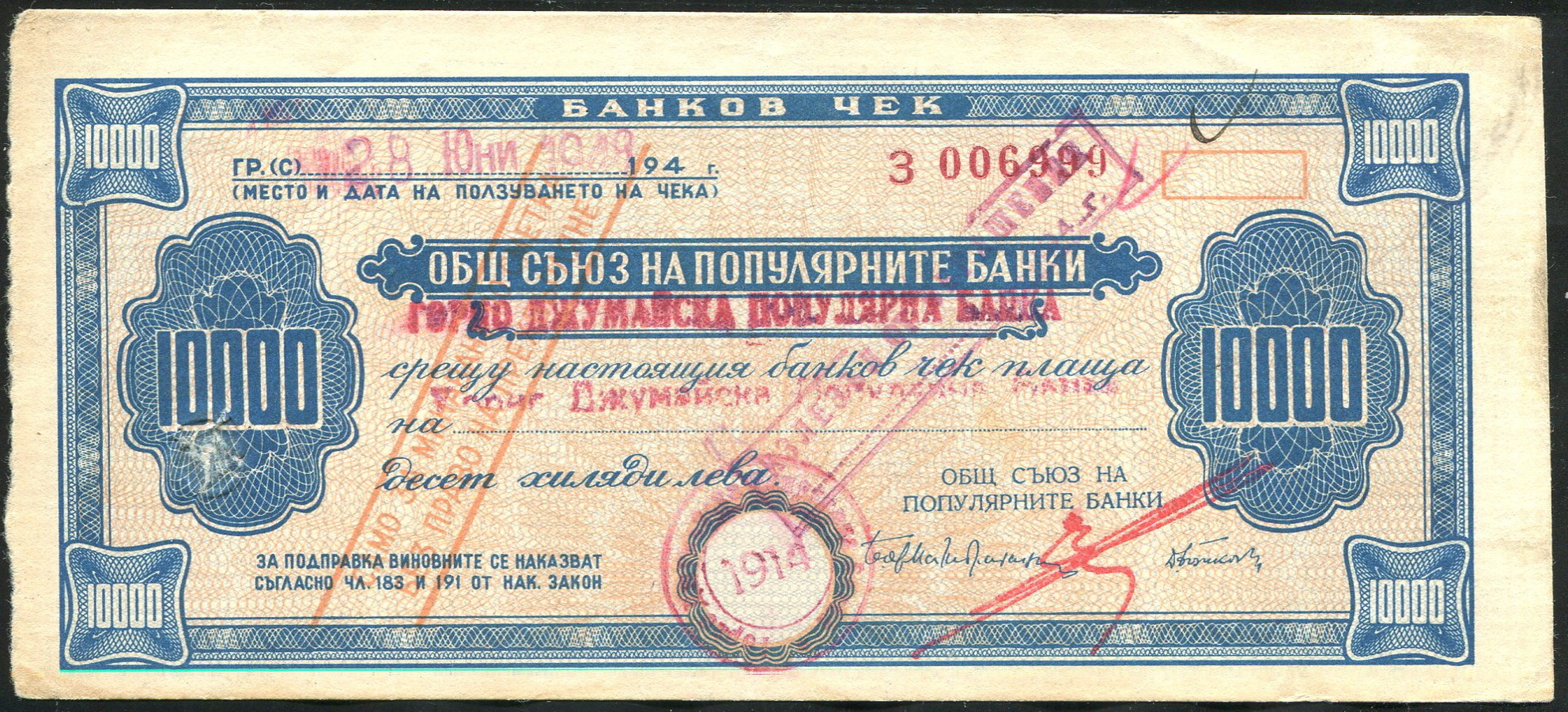 Дорожный чек 10000 левов 1940-е (Болгария)