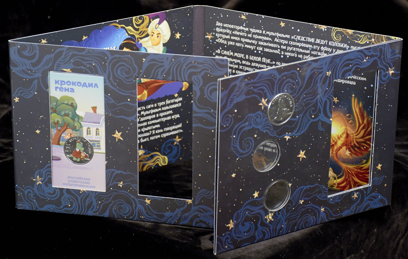 На каждый мультфильм в набор предназначено место под две монеты, одна из которых в цветном исполнении, упакована в индивидуальную подарочную упаковку.