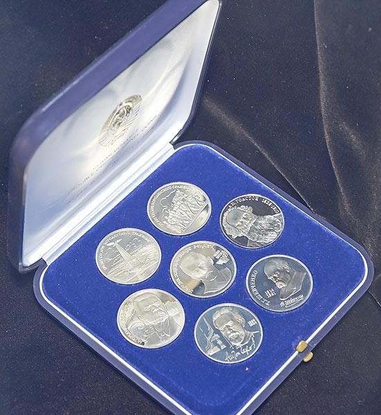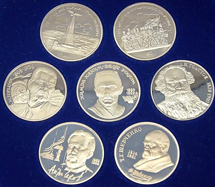 Набор из 7-и памятных рублей СССР в п/у: Бородино (2 вар.), Горький, Ниязи, Чехов, Шевченко, Толстой