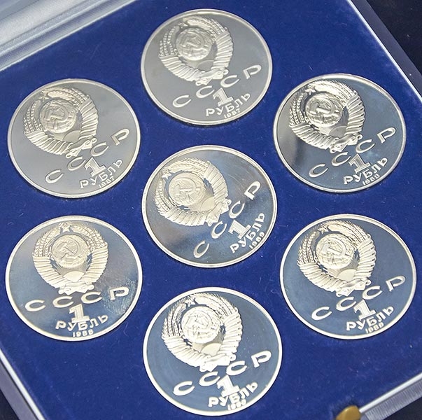 Набор из 7-и памятных рублей СССР в улучшенном исполнении. В оригинальной подарочной коробочке Госбанка СССР.