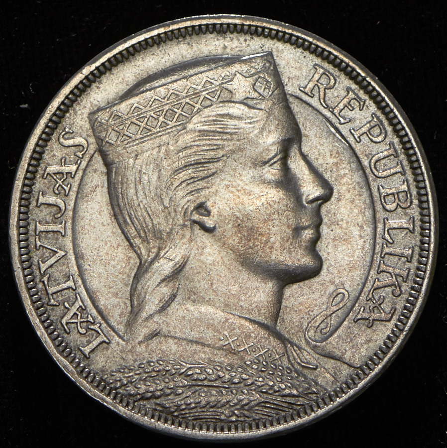 На аверсе изображен аллегорический женский образ, вокруг которого есть надпись – «LATVIJAS REPUBLIKA».