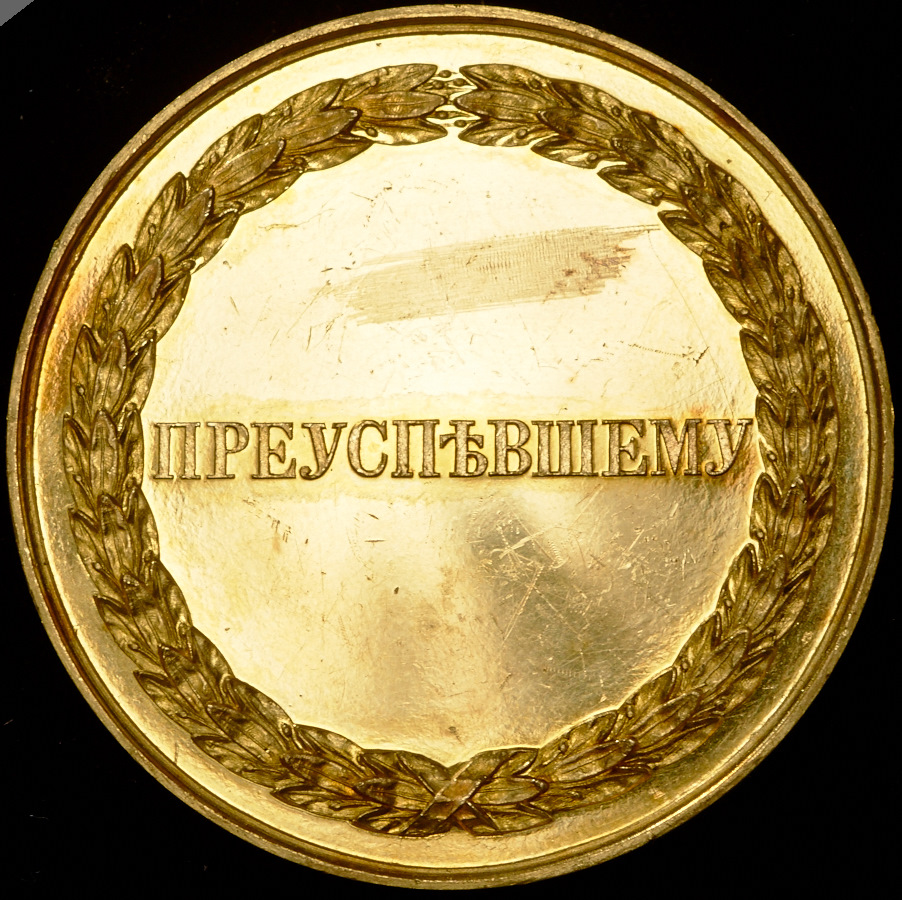 Медальер аверса А.А. Грилихес (сын), справа на линии обреза изображения "ГРИЛИХ.", копия штемпеля А.П. Лялина 1835 г. по рисунку графа Ф.П. Толстого.