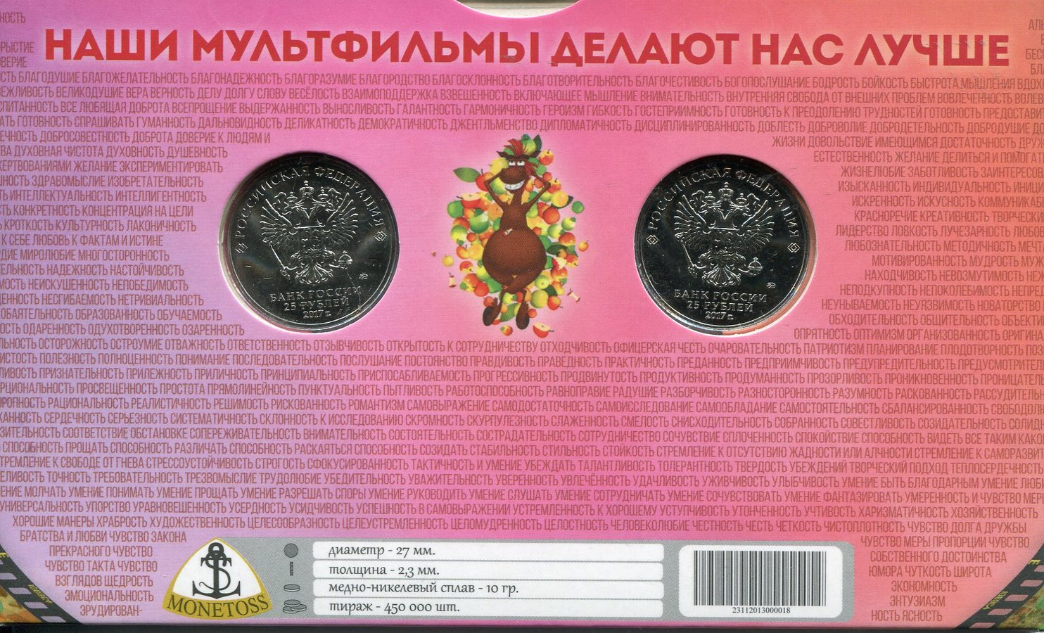 Содержит две памятные монеты номиналом 25 рублей 2017 г. «Российская (советская) мультипликация»