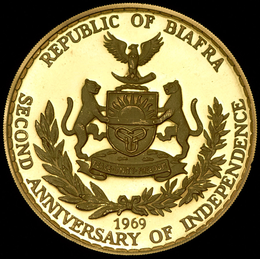 Легенда аверса "REPUBLIC OF BIAFRA / 1969 / SECOND ANNIVERSARY OF INDEPENDENCE".
