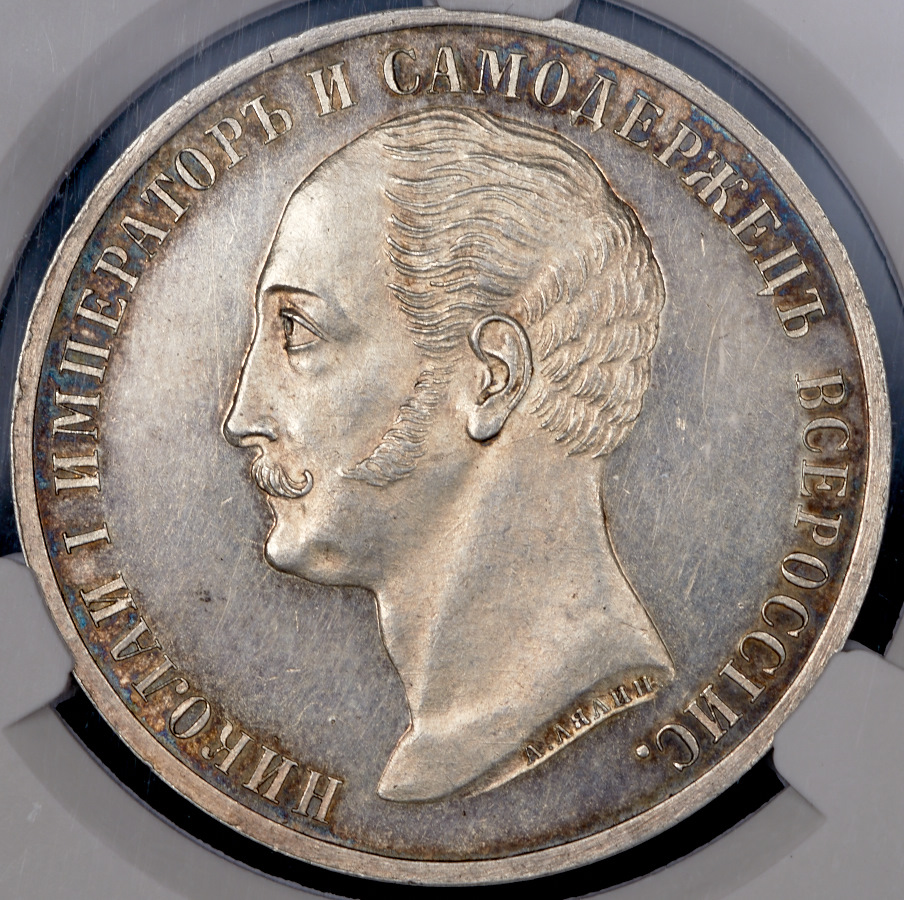 Чеканен по случаю открытия памятника императору Николаю I в Санкт-Петербурге. В обрезе шеи "А.Лялин".