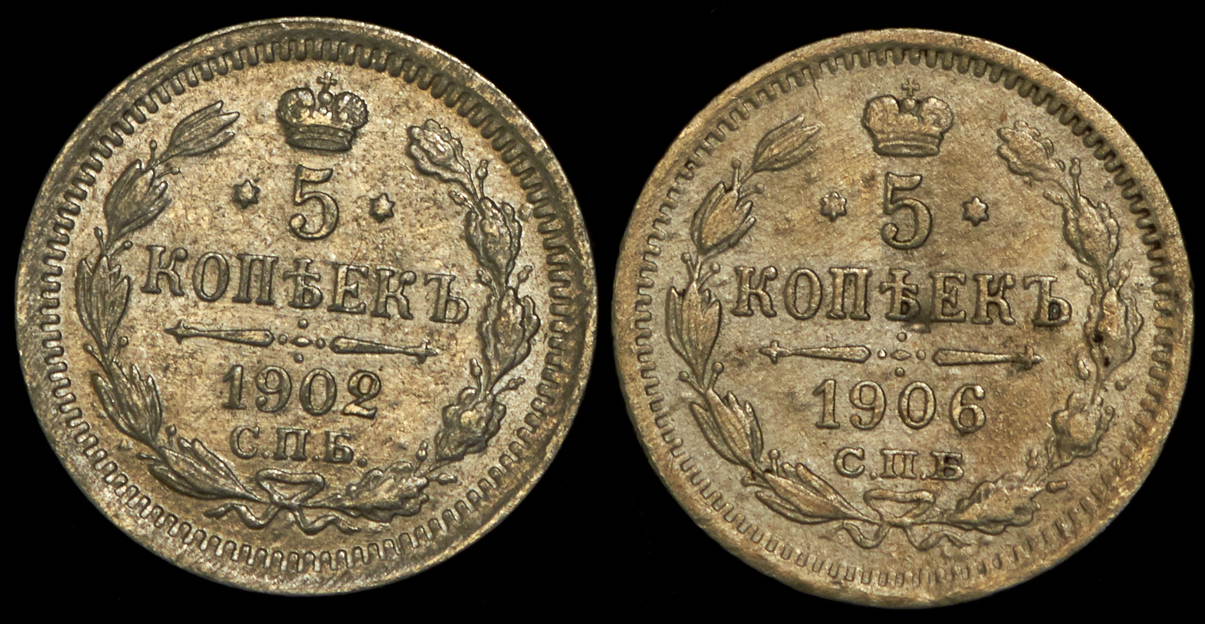 В набор вошли 5 копеек 1902 и 1906 гг.